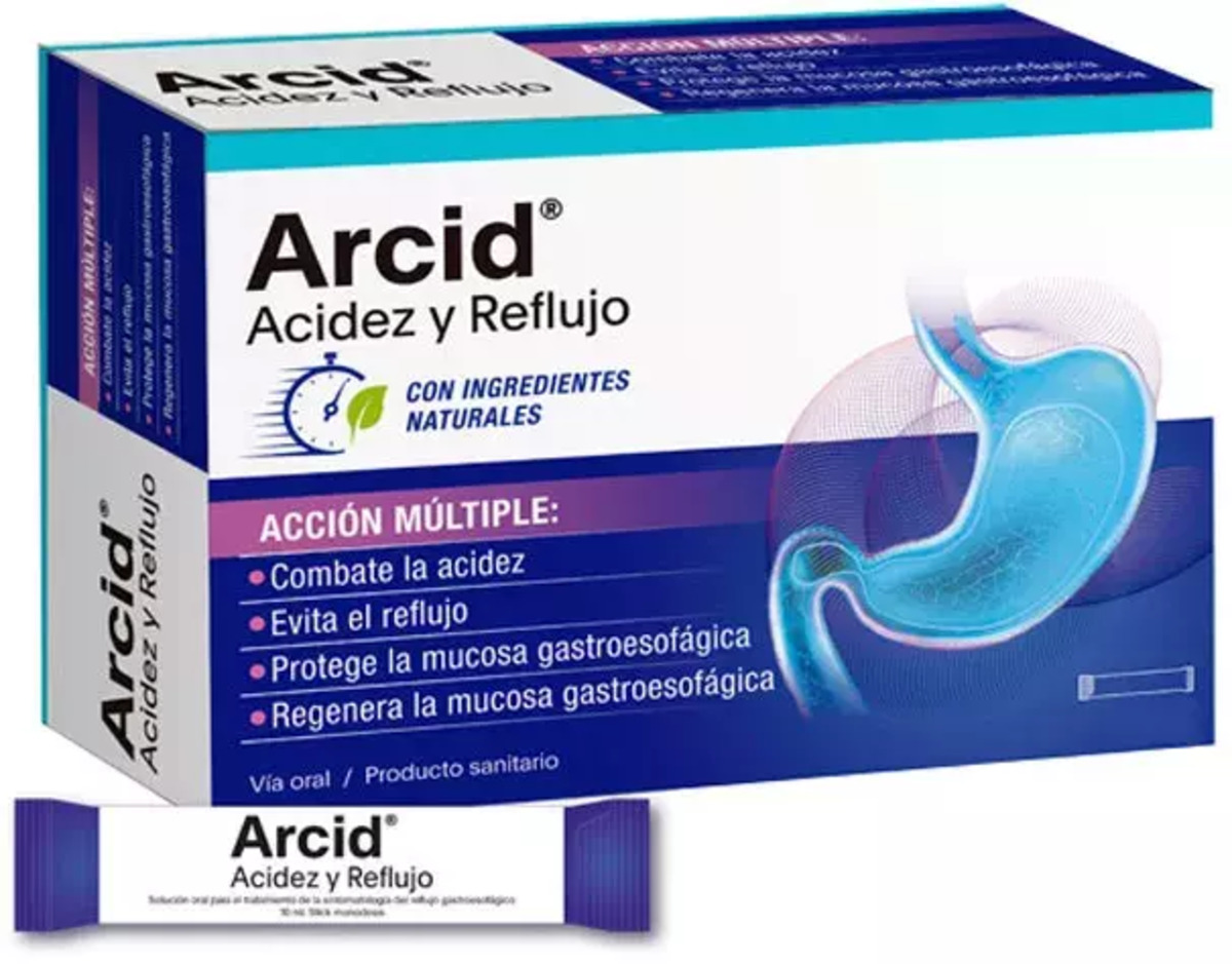 Arcid Acidez y Reflujo es una solución oral para el tratamiento de los síntomas del reflujo gastroesofágico. Formulado con Bicarbonato sódico y carbonato de calcio que neutralizan la hiperacidez del estómago, reequilibrando el pH normal del estómago. También contiene Galactomanano, Malva sylvestris y Acido hialurónico para evitar el reflujo, proteger y regenerar la mucosa gastroesofágica