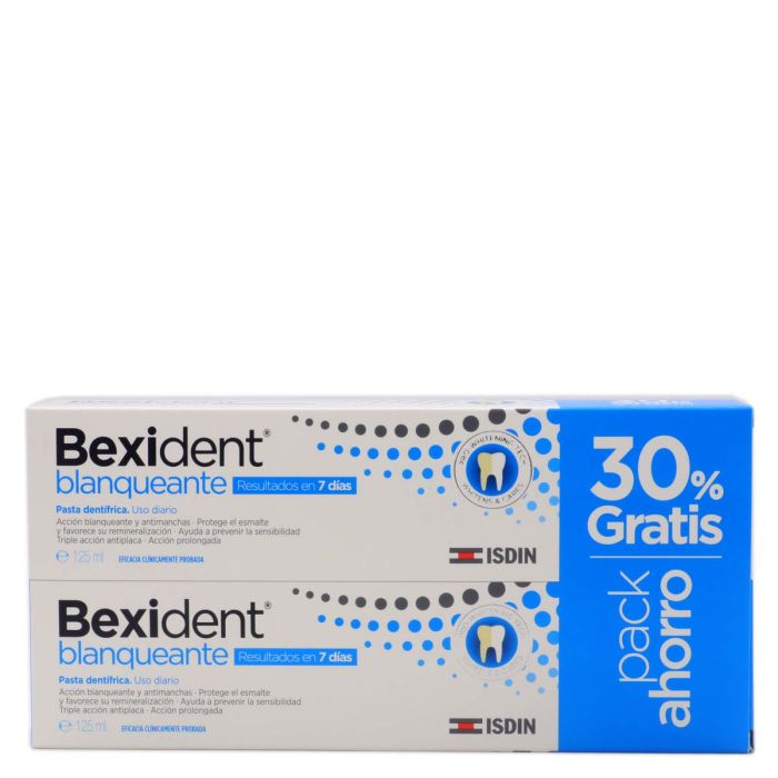 - Pack promocional de higiene bucodental blanqueante que incluye colutorio y pasta dentífrica de la gama Bexident Blanqueante de ISDIN.