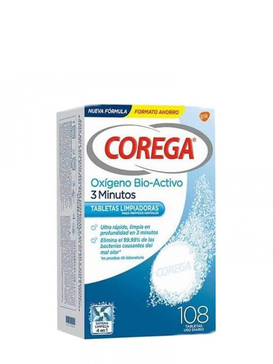 Descripción del producto: Corega Oxígeno Bio-Activo es un limpiador de prótesis dental que viene en forma de tabletas efervescentes. Cada paquete contiene 108 tabletas que se disuelven rápidamente en agua para eliminar la suciedad, las manchas y las bacterias de las prótesis dentales. Este producto utiliza oxígeno bio-activo para penetrar en las áreas más difíciles de alcanzar y dejar la prótesis limpia y fresca.