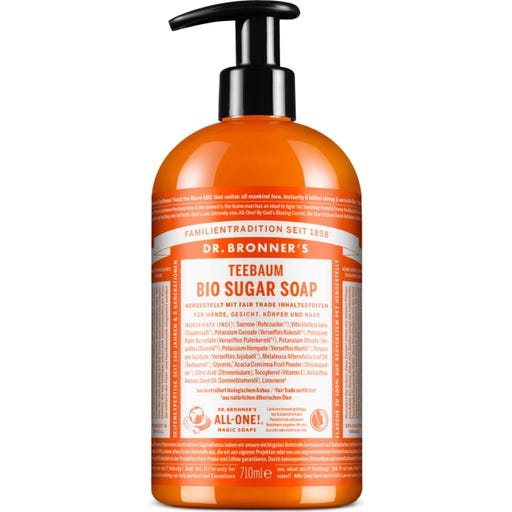 - Incluye aceite esencial de árbol del té dentro de la gama Dr. Bronner’s Organic Sugar Soap