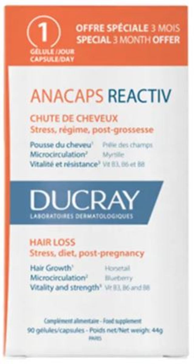 Las Cápsulas Anacaps DUCRAY Reactiv están enriquecidas con una gran variedad de Vitaminas y Minerales, que actúan directamente en el bulbo piloso mejorando el mantenimiento de tu pelo en perfectas condiciones.