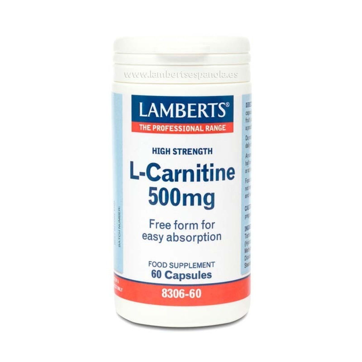 Suplemento de L-Carnitina en cápsulas de 500 mg de la marca Lamberts.