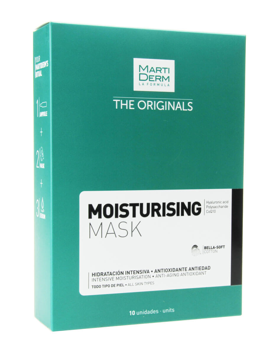 Descripción del producto: Las máscaras hidratantes MartiDerm The Originals Mask Moisturising son un conjunto de 10 máscaras faciales diseñadas para hidratar y nutrir la piel seca y deshidratada. La fórmula contiene una combinación de ácido hialurónico, aloe vera y extracto de manzanilla para proporcionar una hidratación intensa y una piel suave y flexible.