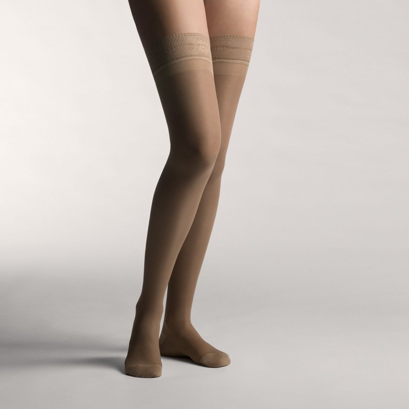 Banda superior de encaje con silicona de sujeción para ayudar a evitar que la media se deslice.