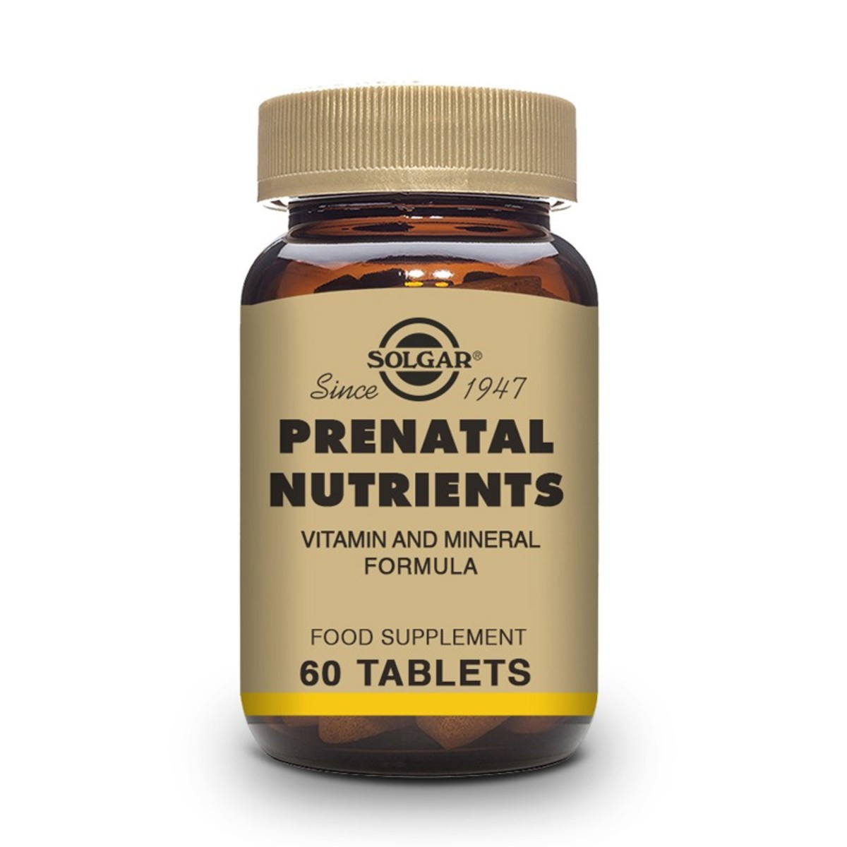 Suplemento de nutrientes prenatales de Solgar en formato de 60 comprimidos.