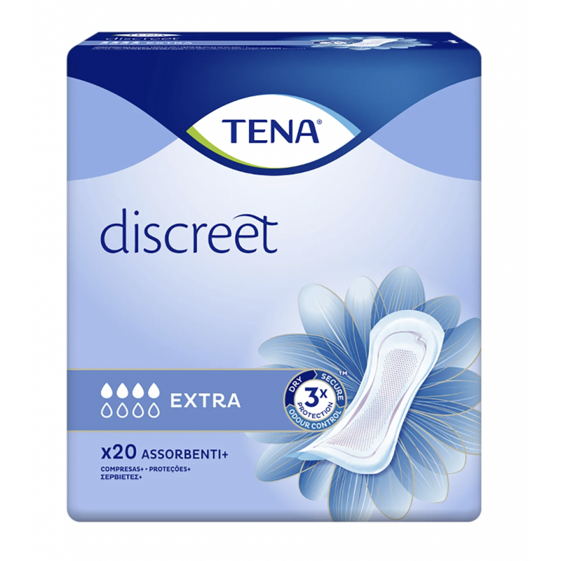 - Paquete con 20 unidades de compresas/protectores absorbentes para incontinencia urinaria leve a moderada en mujer.