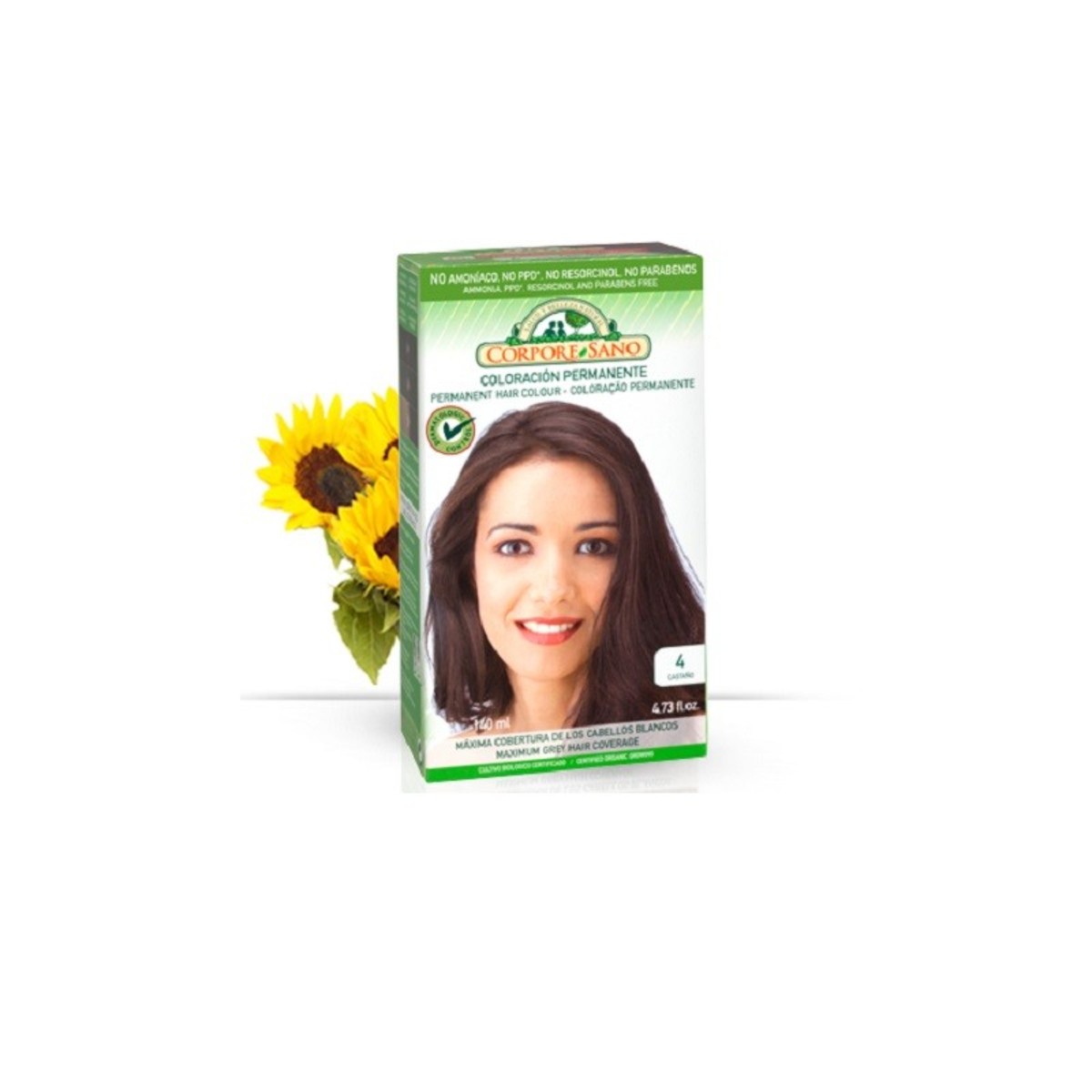 Tinte permanente de color castaño 4 de la marca Corpore Sano, con una presentación de 140 ml.